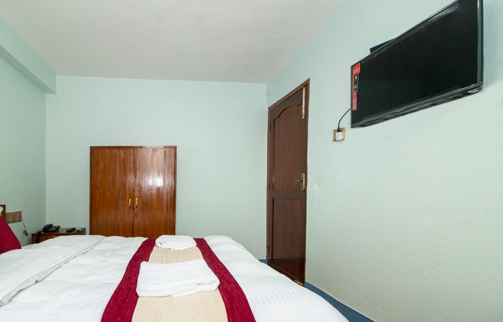 Our deluxe room has a comfortable double bed with ample space to move around in the room. The washroom is attached to the room and has a proper ventilation system. There's 24-hour hot/cold running water in the bathroom. The room is equipped with all the necessary comforts like AC, TV, WiFi, water boiler, hair dryer, toiletries, etc.
